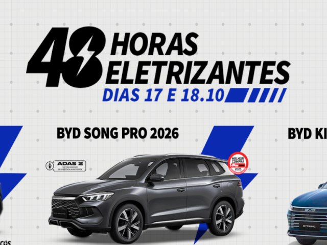 (16/10/2025) – Sucesso em todas as edições passadas, a BYD anuncia a chegada de mais uma edição das 48 horas mais eletrizantes do Brasil: nos dias 17 e 18 de outubro, todas as concessionárias da marca no país oferecerão modelos 100% elétricos e super-híbridos plug-in com condições imperdíveis na linha 2026, criando mais oportunidades para que um maior número de brasileiros possa garantir a combinação de tecnologia e sustentabilidade com conforto, design e segurança em sua garagem.